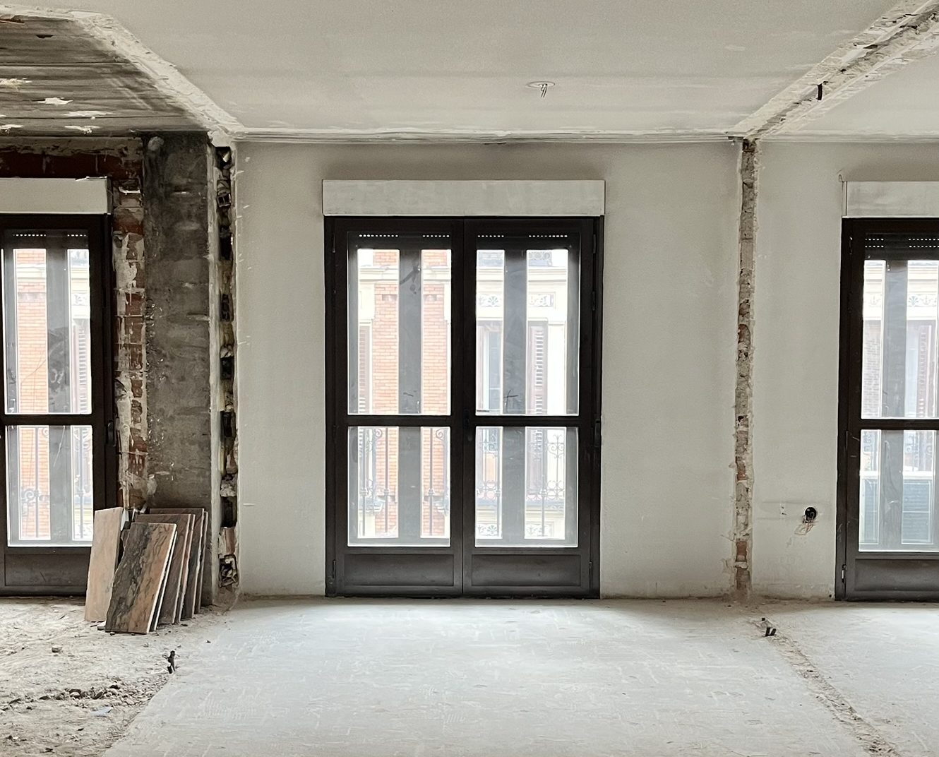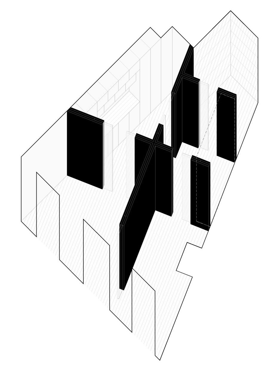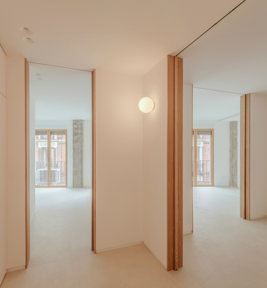 Los cerramientos móviles entre estancias se construyen a través de tabiques dobles que permiten su formalización de suelo a techo y su acotación entre anchas jambas.
