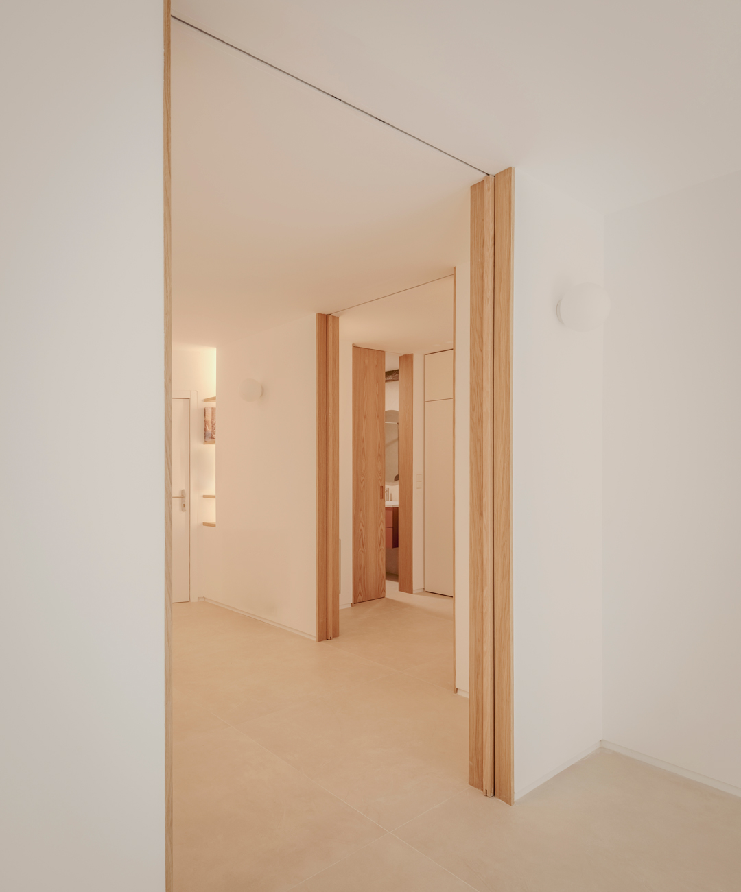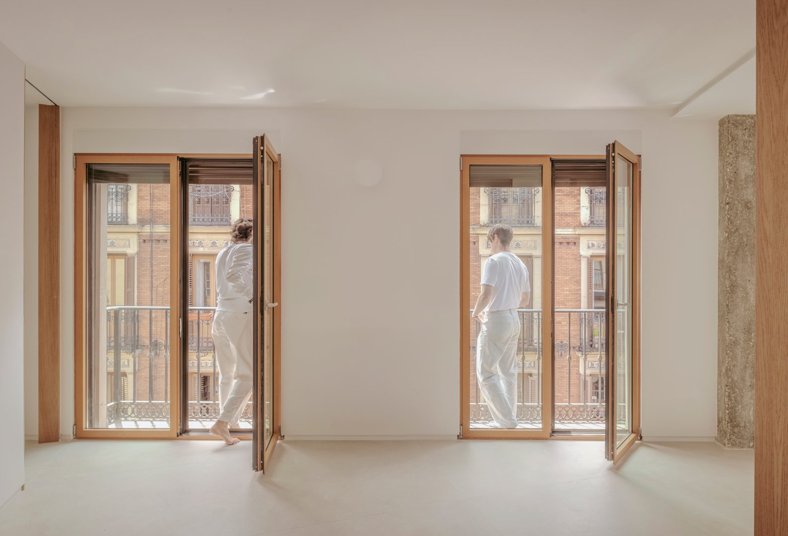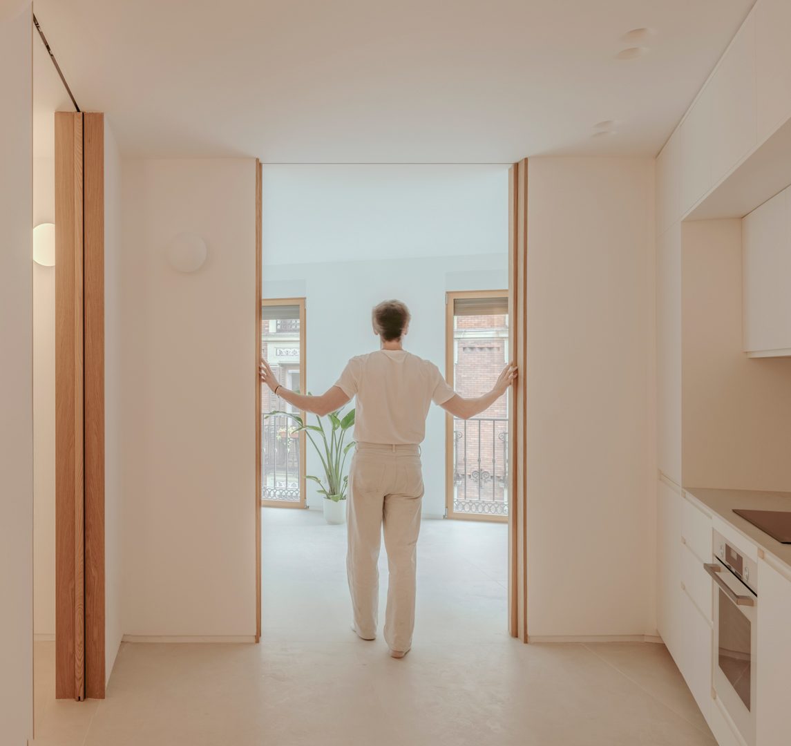 Se materializan en acabado roble oscuro, contrastando con los paramentos fijos de acabado claro y orientando las miradas hacia el exterior.