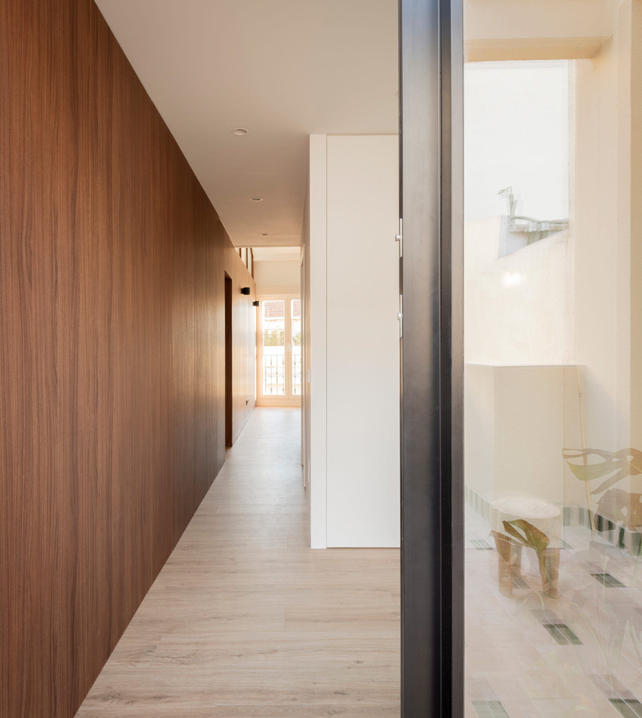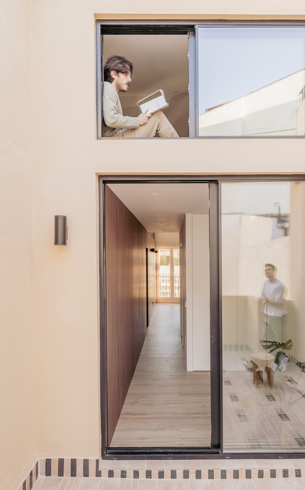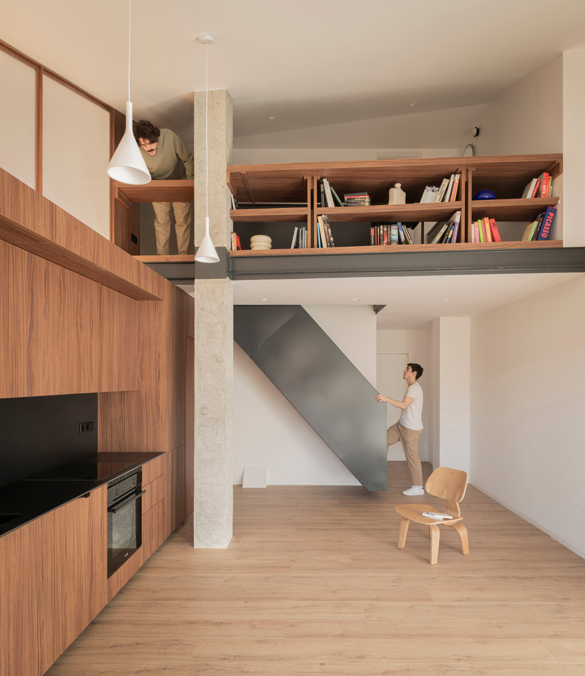 - The public area is a large living-dining-kitchen space that opens to the street through two balconies and is connected to the first floor.