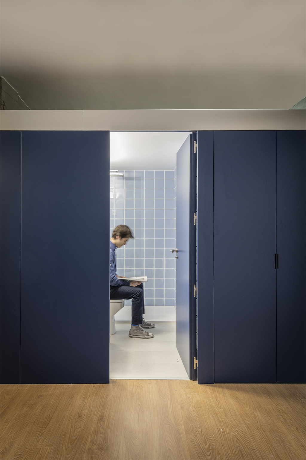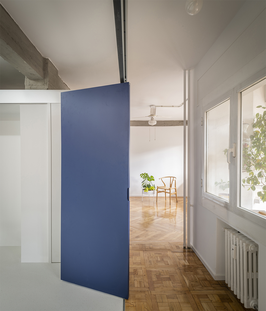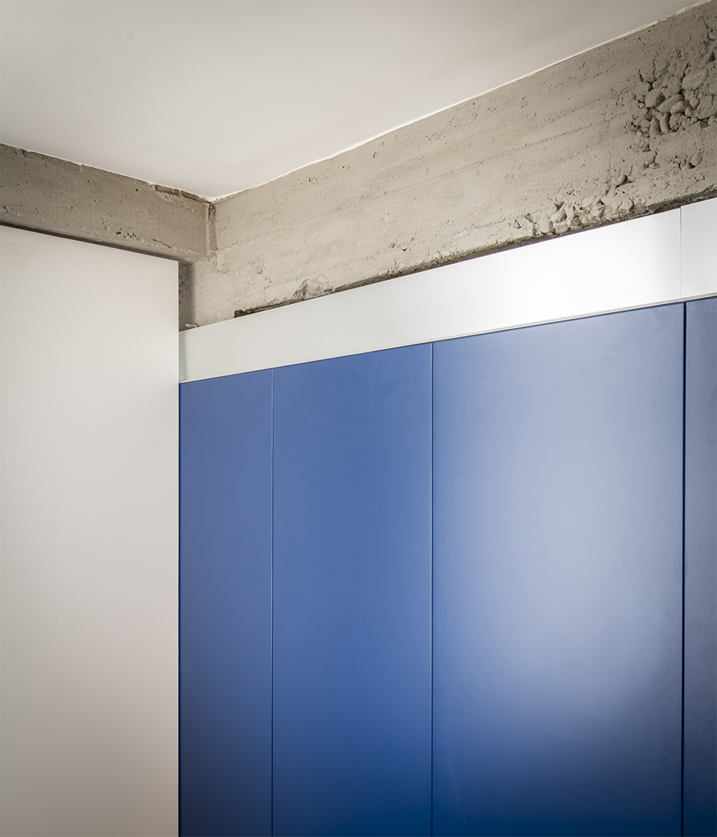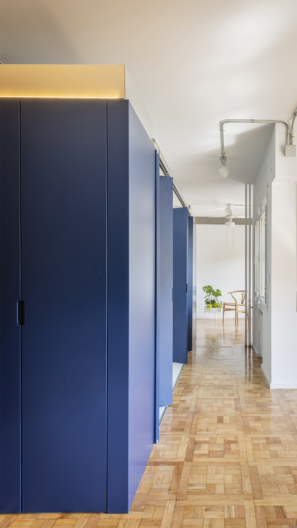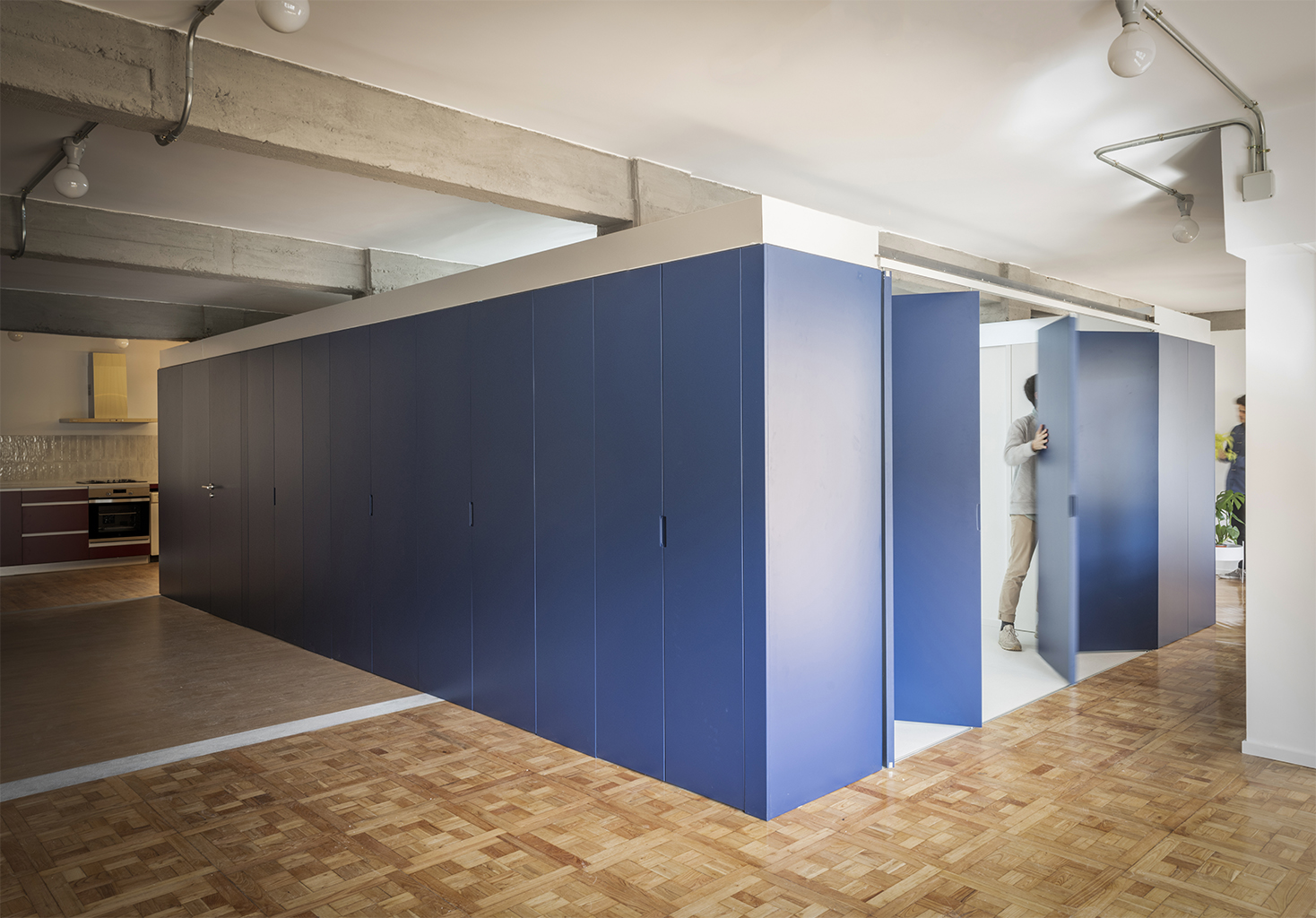 The intervention is clear: to equip the dwelling with a permeable and prism-like furniture piece measuring 7 by 5 meters and 2.30 meters high, designed to incorporate the pre-existing structural pillars. The beams pass intact over this piece, lacquered in RAL 5003, thus emphasizing the concept of a furnished unit and distinguishing itself from the pre-existing structure.