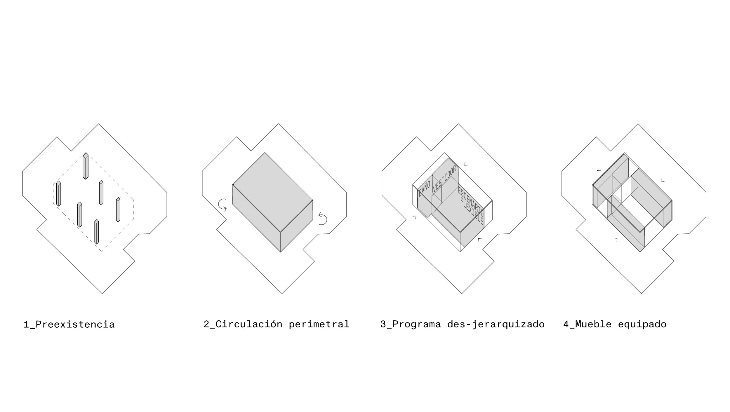 Completa el recorrido en torno a la caja el resto del programa: cocina, salón, dormitorio, sala de estudio y baño pasante; como parte de la circulación perimetral, des-jerarquizando la relación tradicional entre espacios.