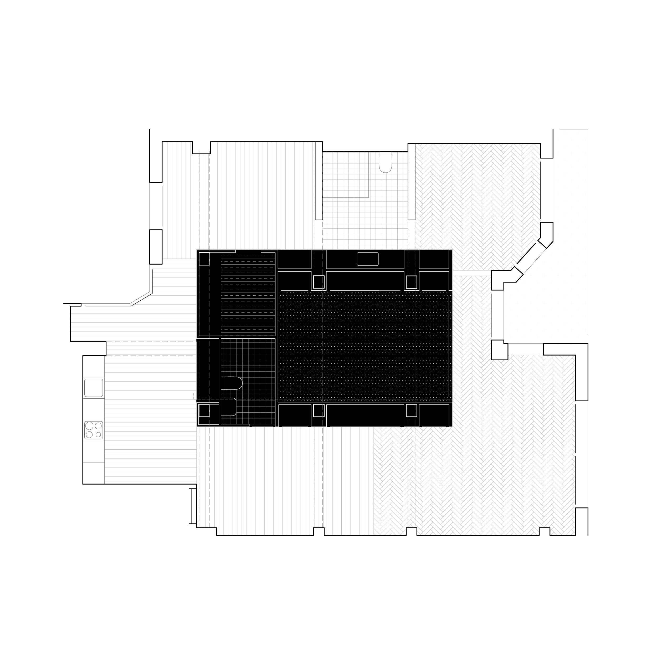 The circulation around the box includes the rest of the program: kitchen, living room, bedroom, study room, and en-suite bathroom; as part of the peripheral circulation, de-prioritizing the traditional relationship between spaces.