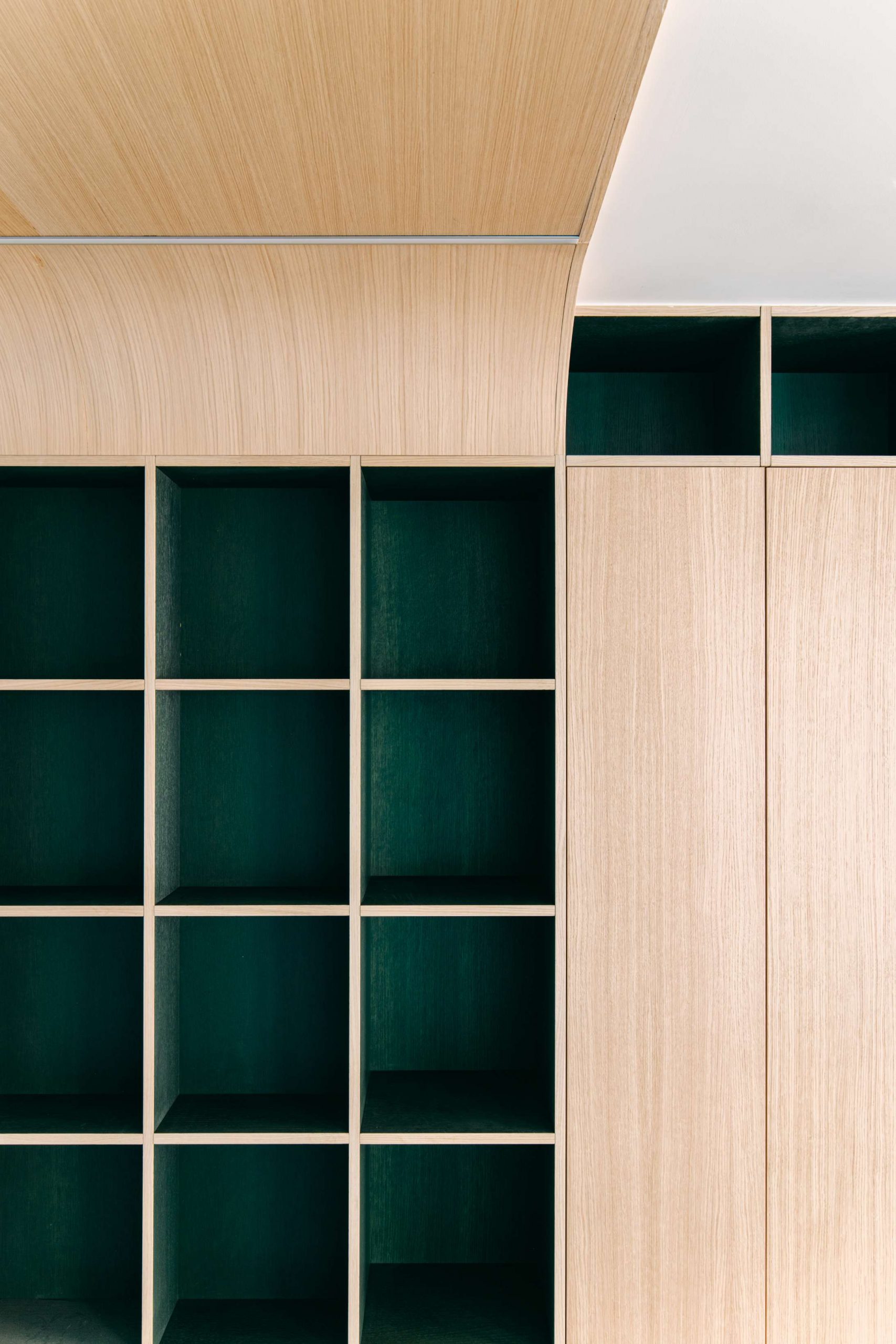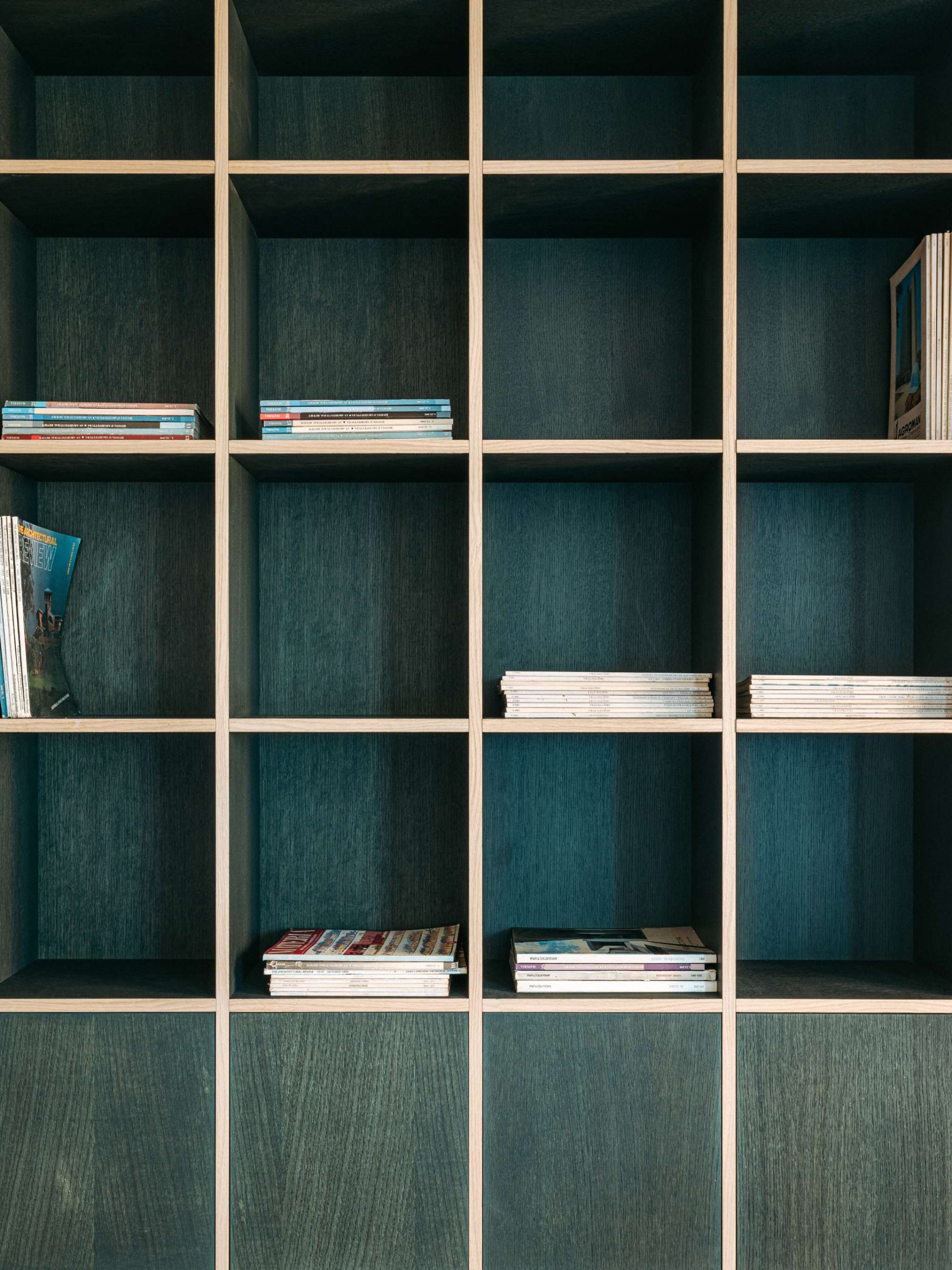 Con el fin de potenciar esta alternancia de llenos y vacíos, la pieza se materializa con un tono oscuro en su interior, mientras que los cantos y puertas del plano principal mantienen su acabado natural.