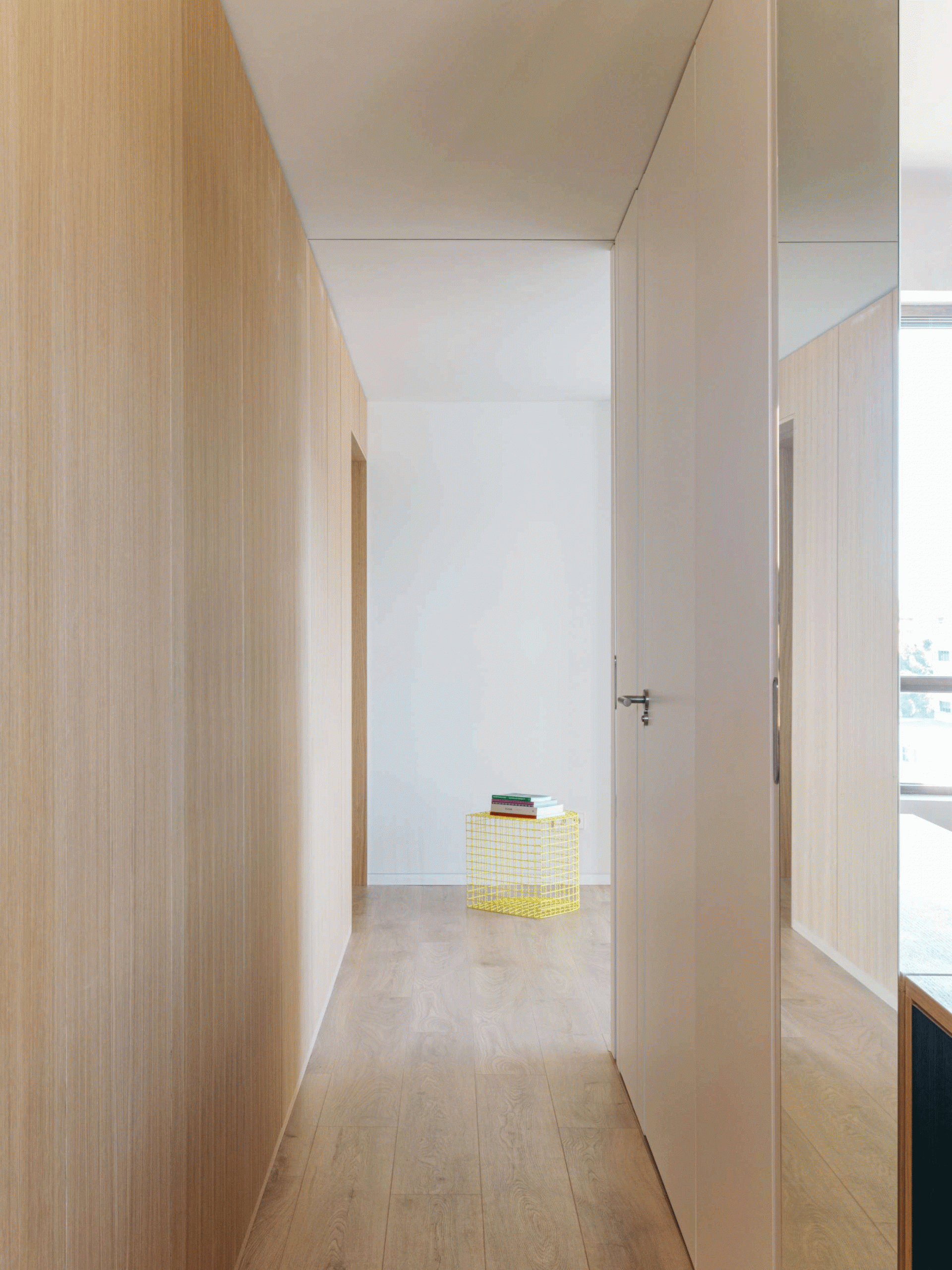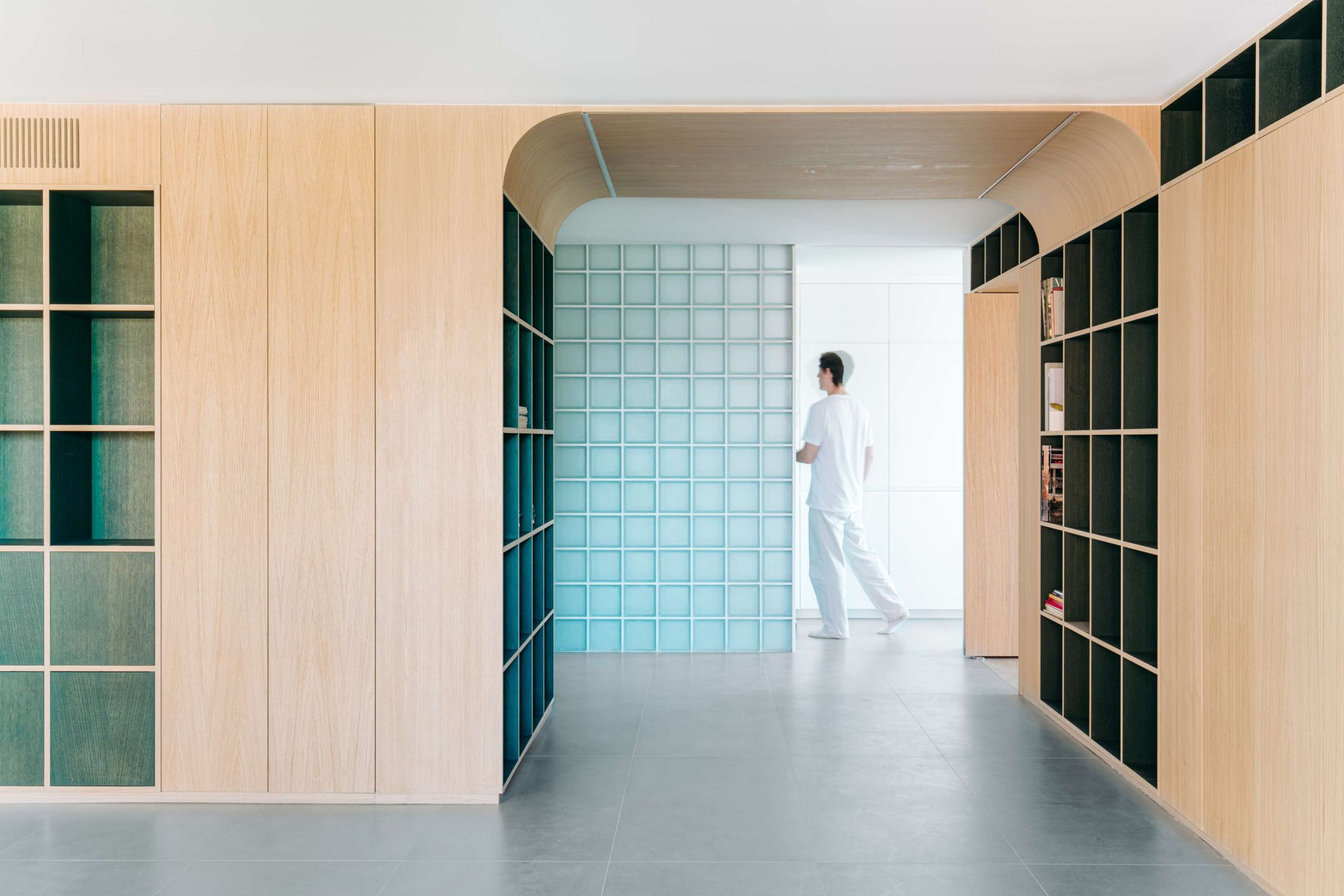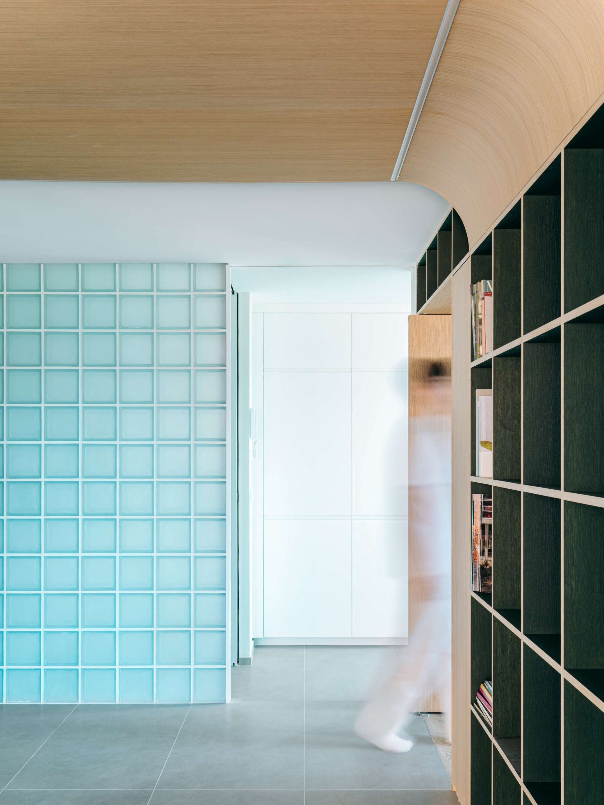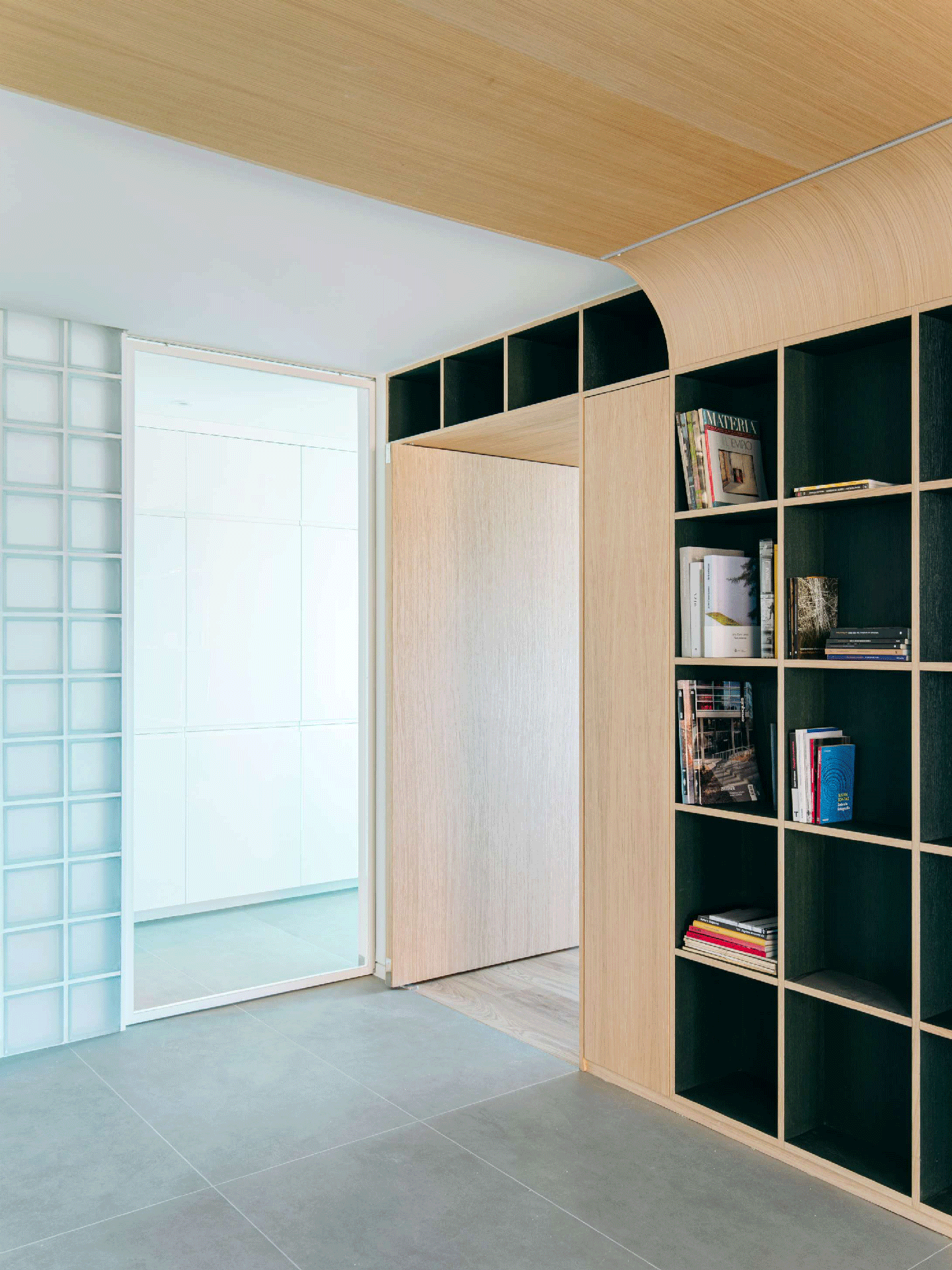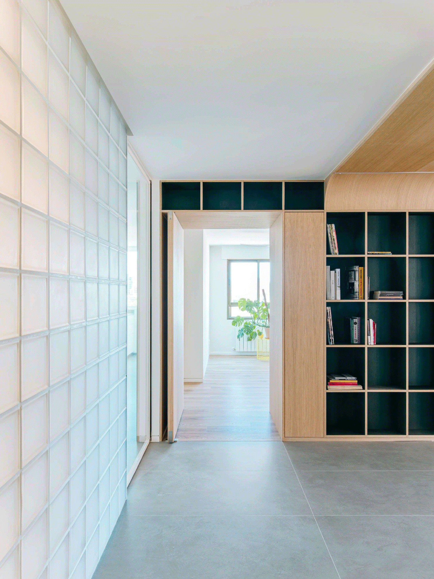 Upon entering, a translucent glass-block wall directs the gaze toward a large carpentry piece. This element, composed in elevation through a set of solids and voids, works as an articulating core which organizes the domestic program.