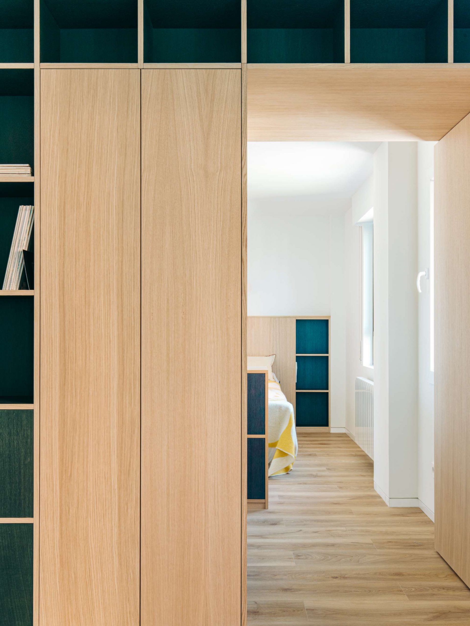 En la zona de noche, el mismo sistema constructivo de la pieza central se reproduce para conformar un cabecero y una cómoda, otorgando unidad formal al conjunto y protegiendo visualmente el espacio de descanso.