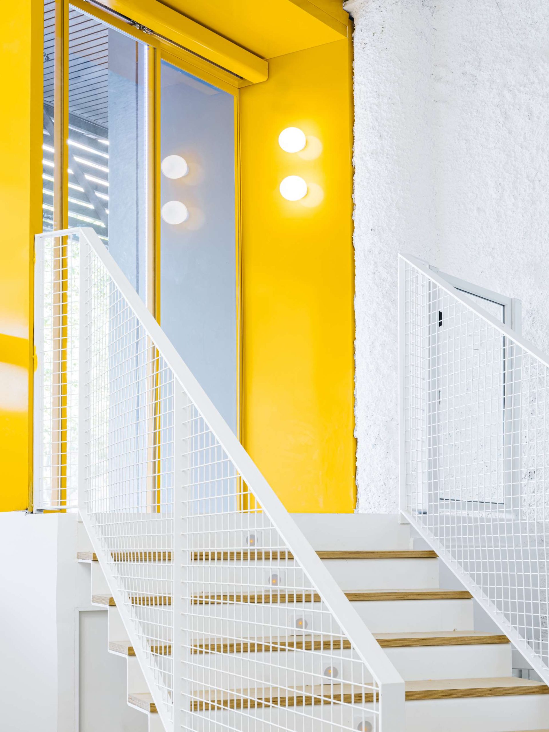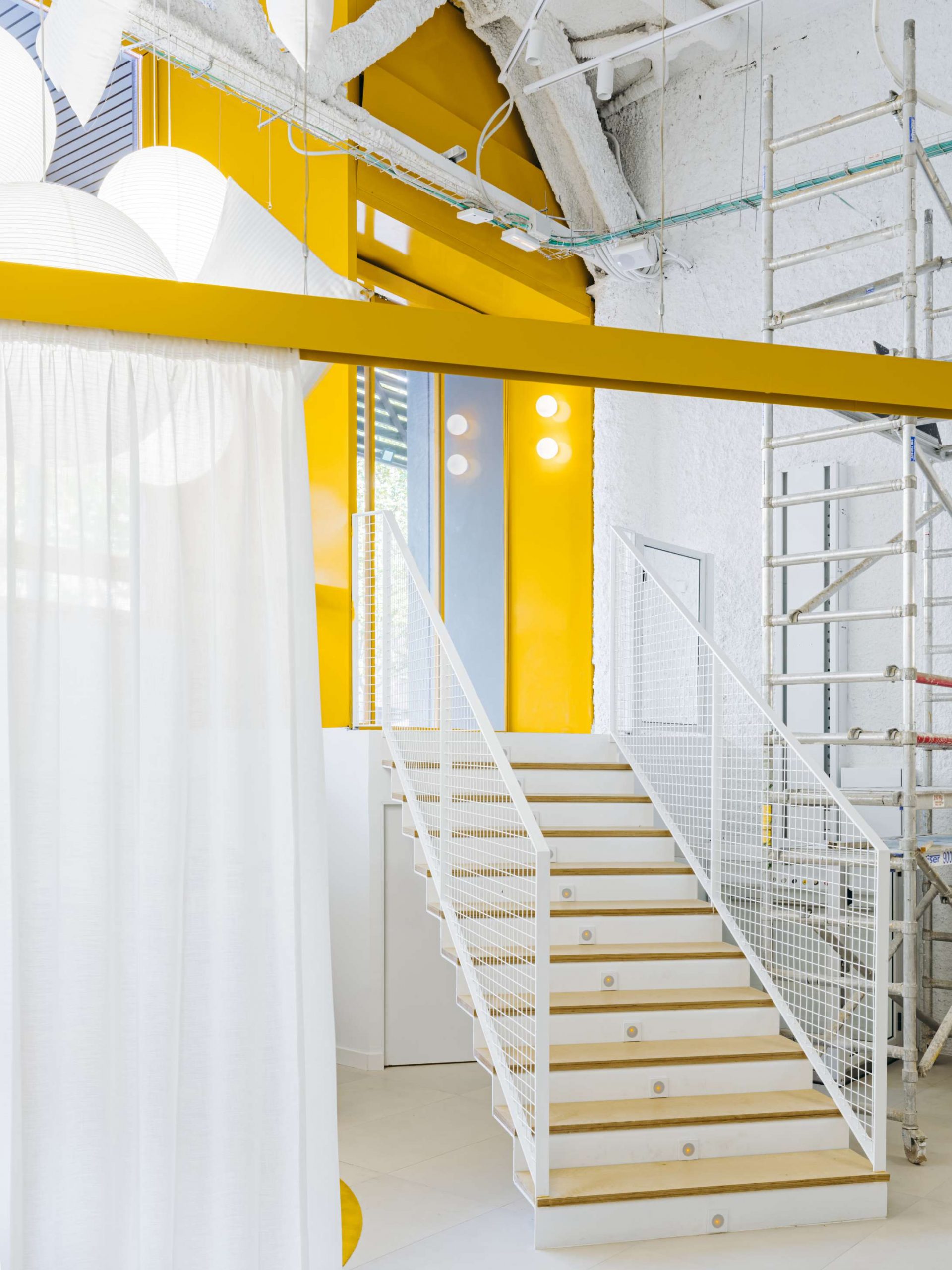 01: La fachada, conformada por un gran bocel amarillo y una escalera de chapa, plantea un acceso diagonal que conecta interior y exterior, fusionando la calle con la tienda y convirtiéndose en un elemento de llamada.