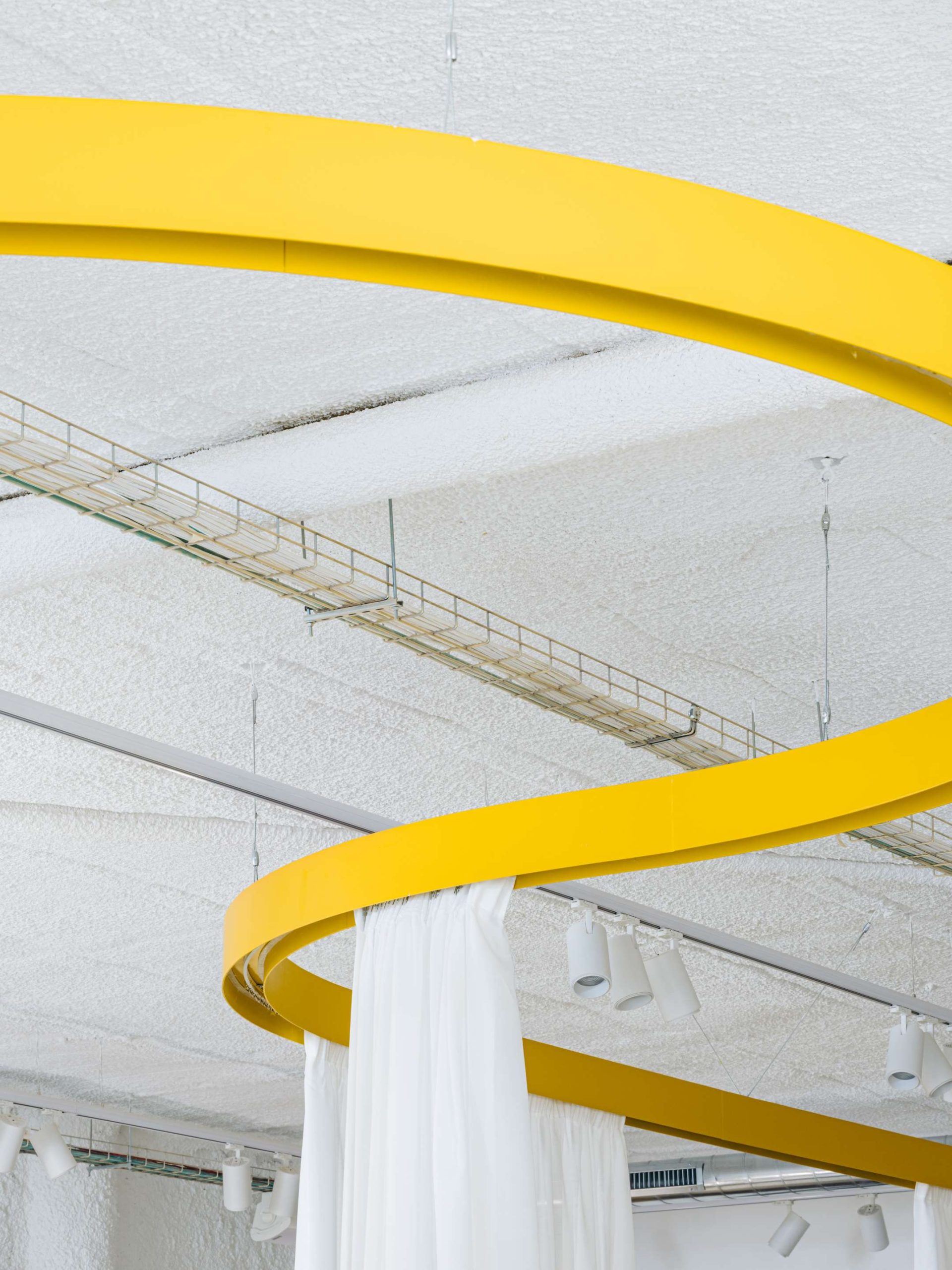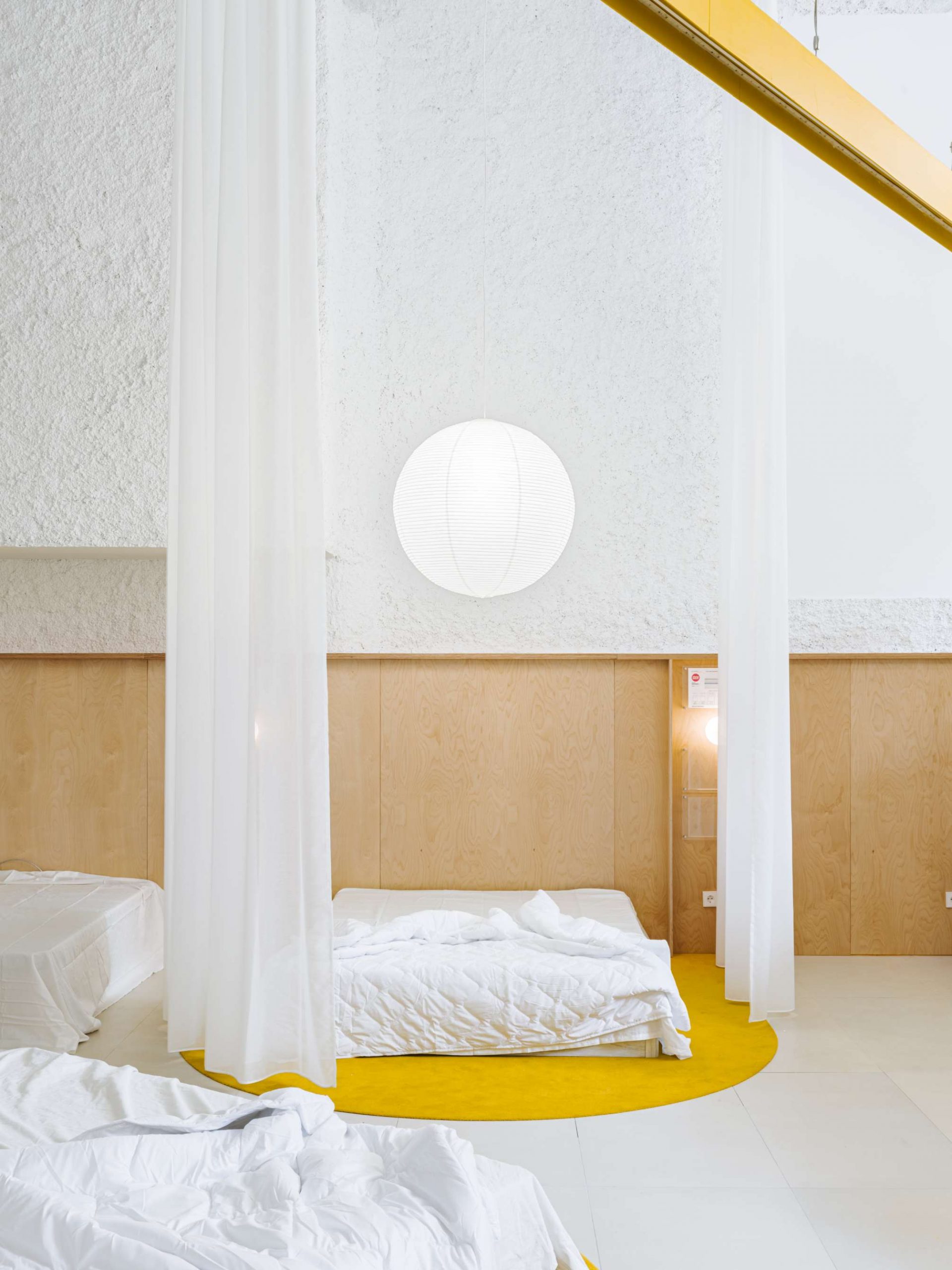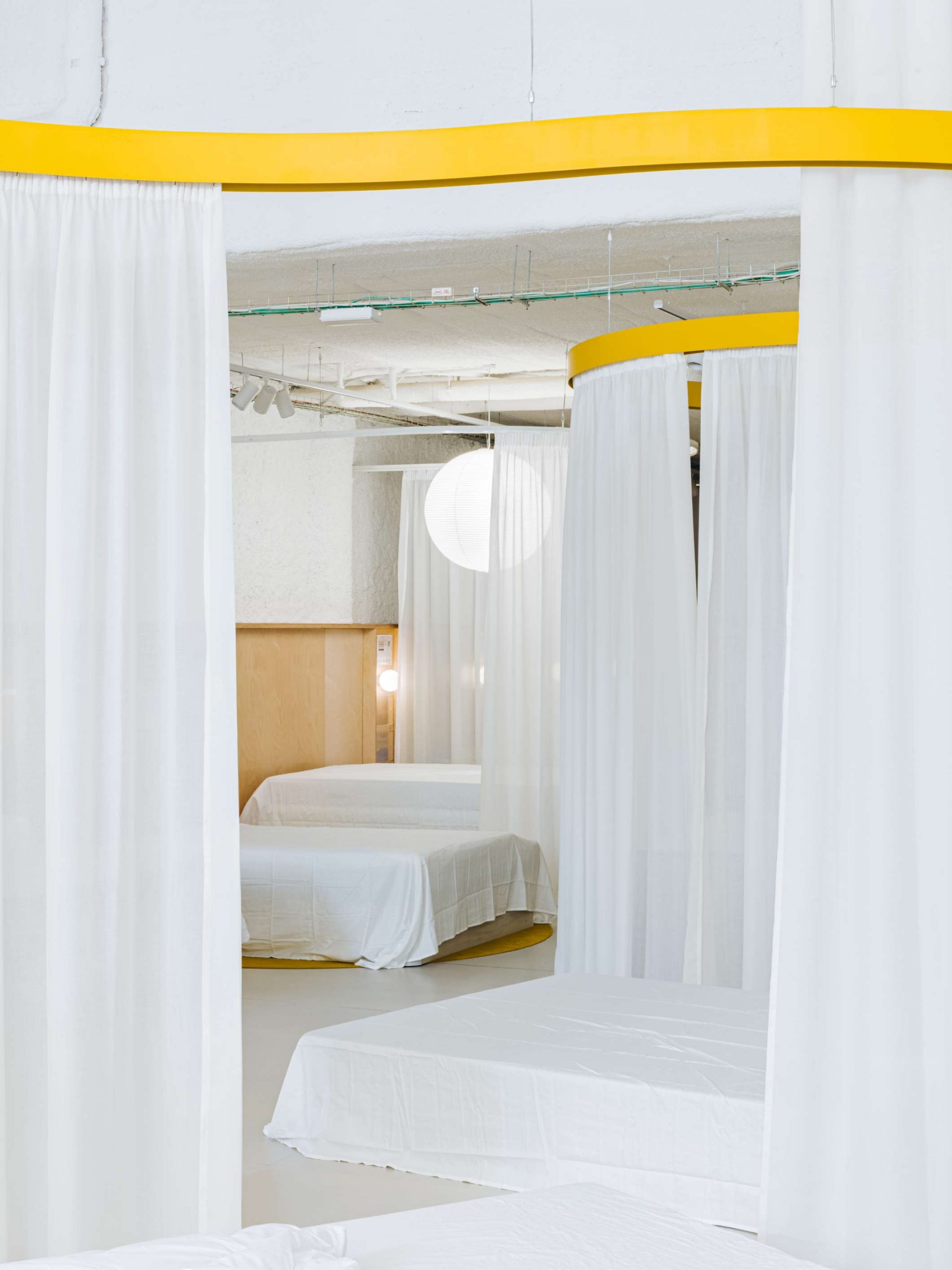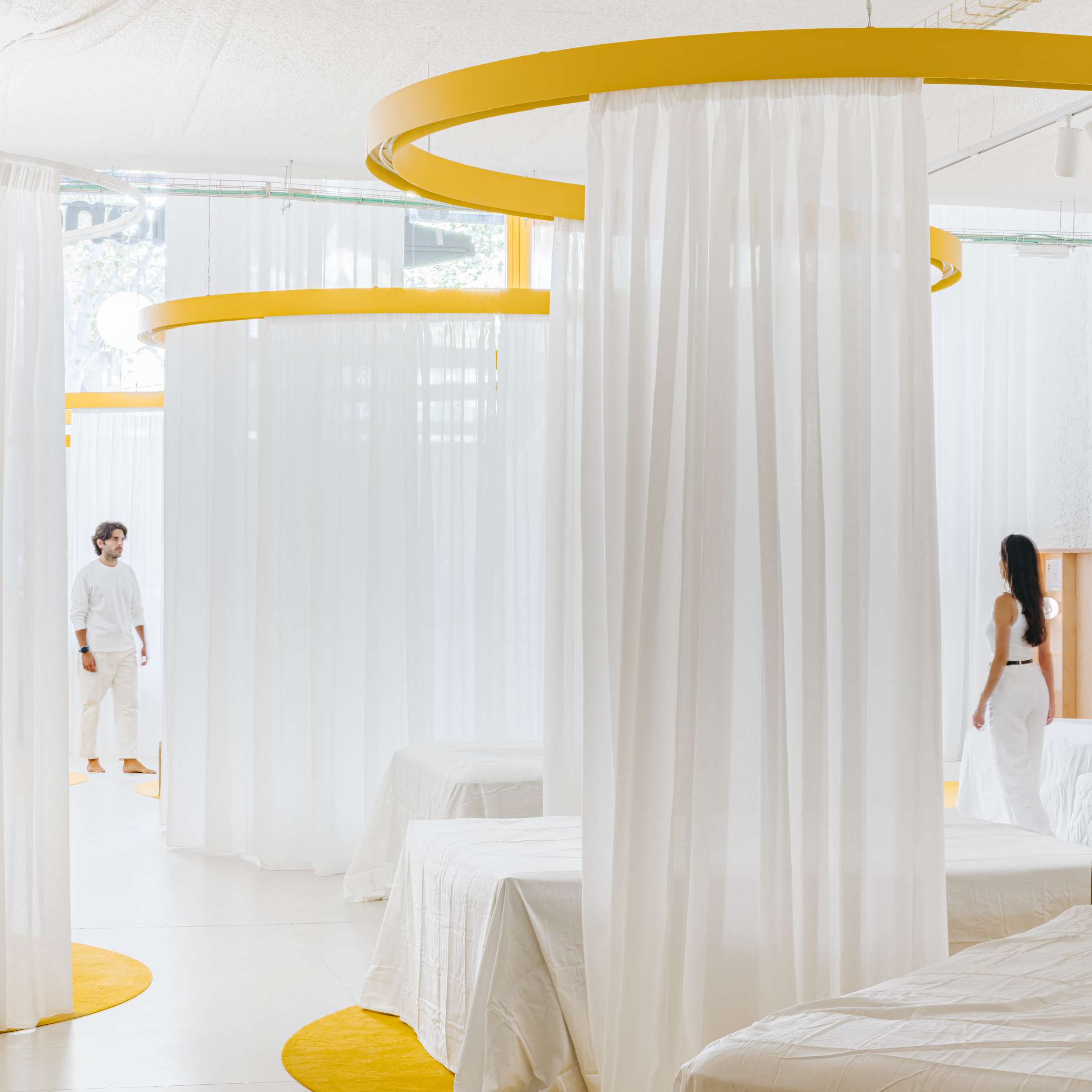 03: Los carriles sinuosos y las grandes cortinas suspendidas filtran las miradas, generando espacios íntimos para la experiencia de los colchones.