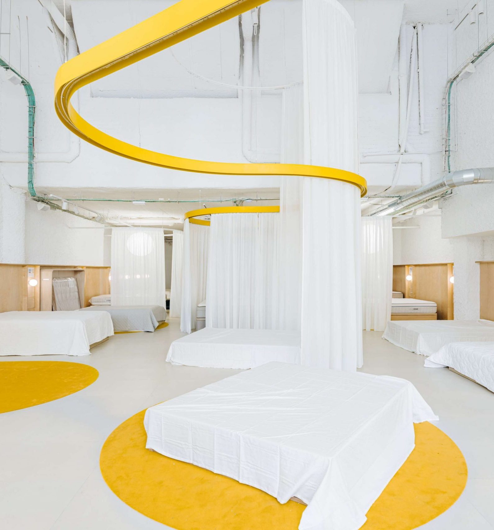 El espacio envuelve al visitante en una atmósfera onírica, marcada por sinuosos carriles descolgados y grandes cortinas que aportan carácter al conjunto y otorgan privacidad a los ambientes domésticos.