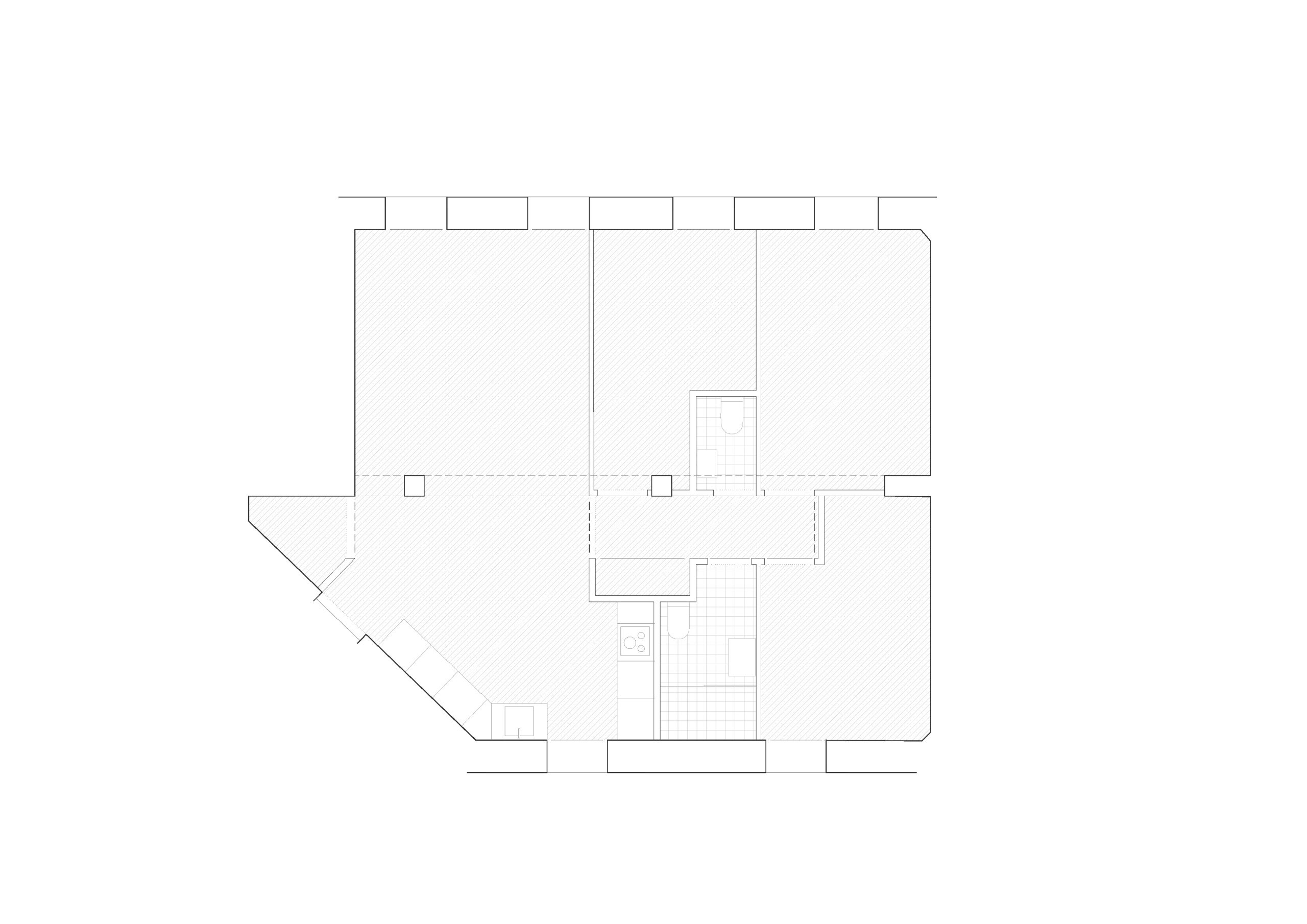 Una distribución homogénea de las superficies, otorgando importancia a la propia del espacio de cocina como lugar de convivencia, marca la premisa programática. La altura de la vivienda (anteriormente cubierta con un falso techo), frente a la altura mínima normativa, sorprende al visitante y le otorga cierta sensación de respiro frente al ruido y bullicio del exterior.