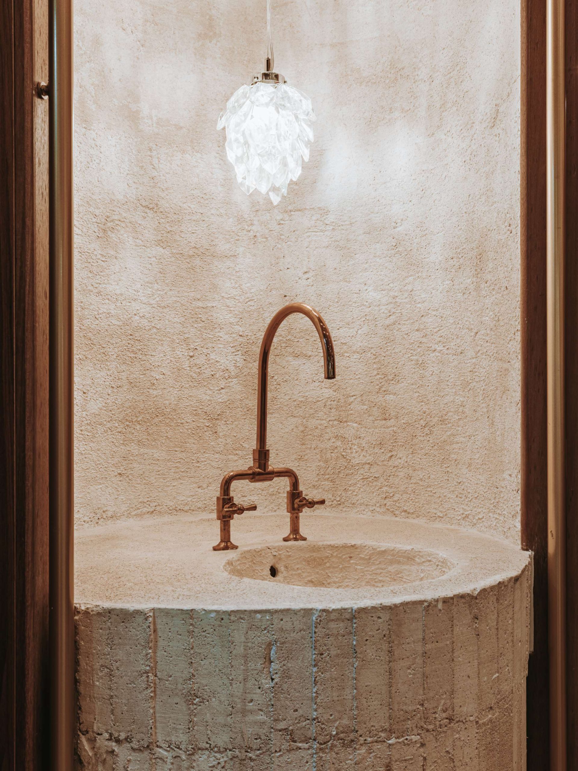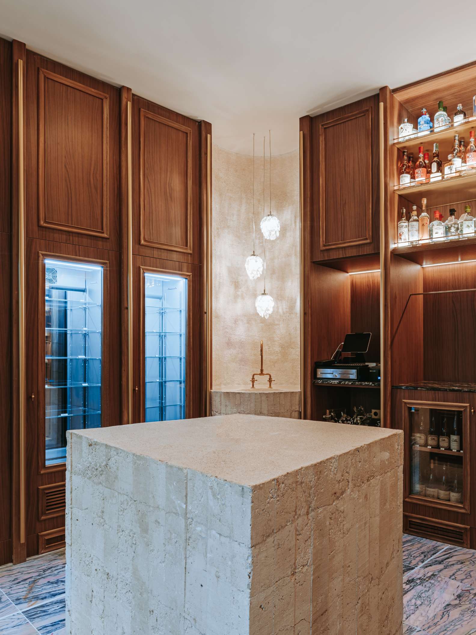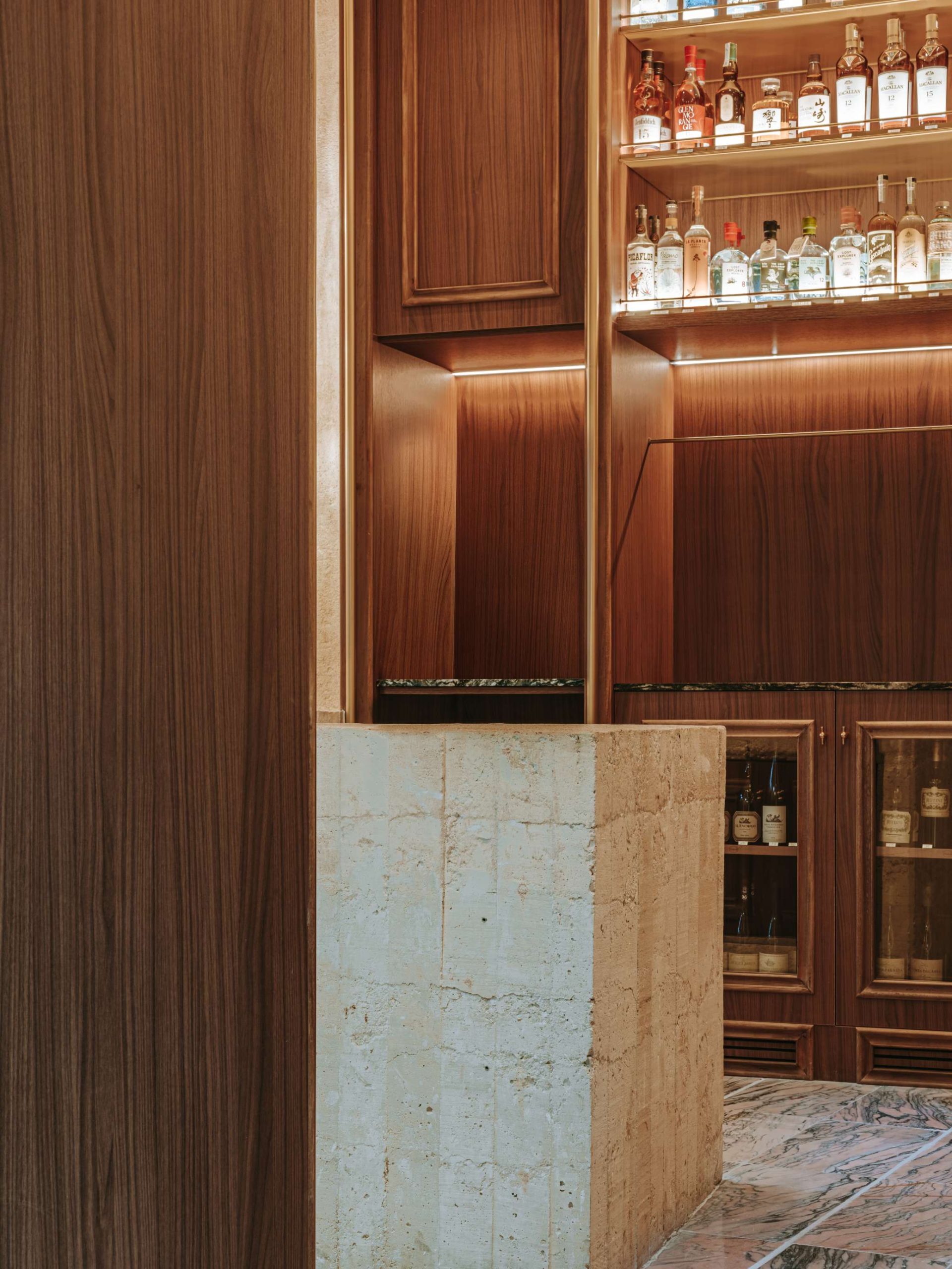En el interior, el mostrador central y el lavabo, ambos construidos en hormigón in situ, introducen un lenguaje material contemporáneo que contrasta con la sobriedad clásica del resto del espacio.