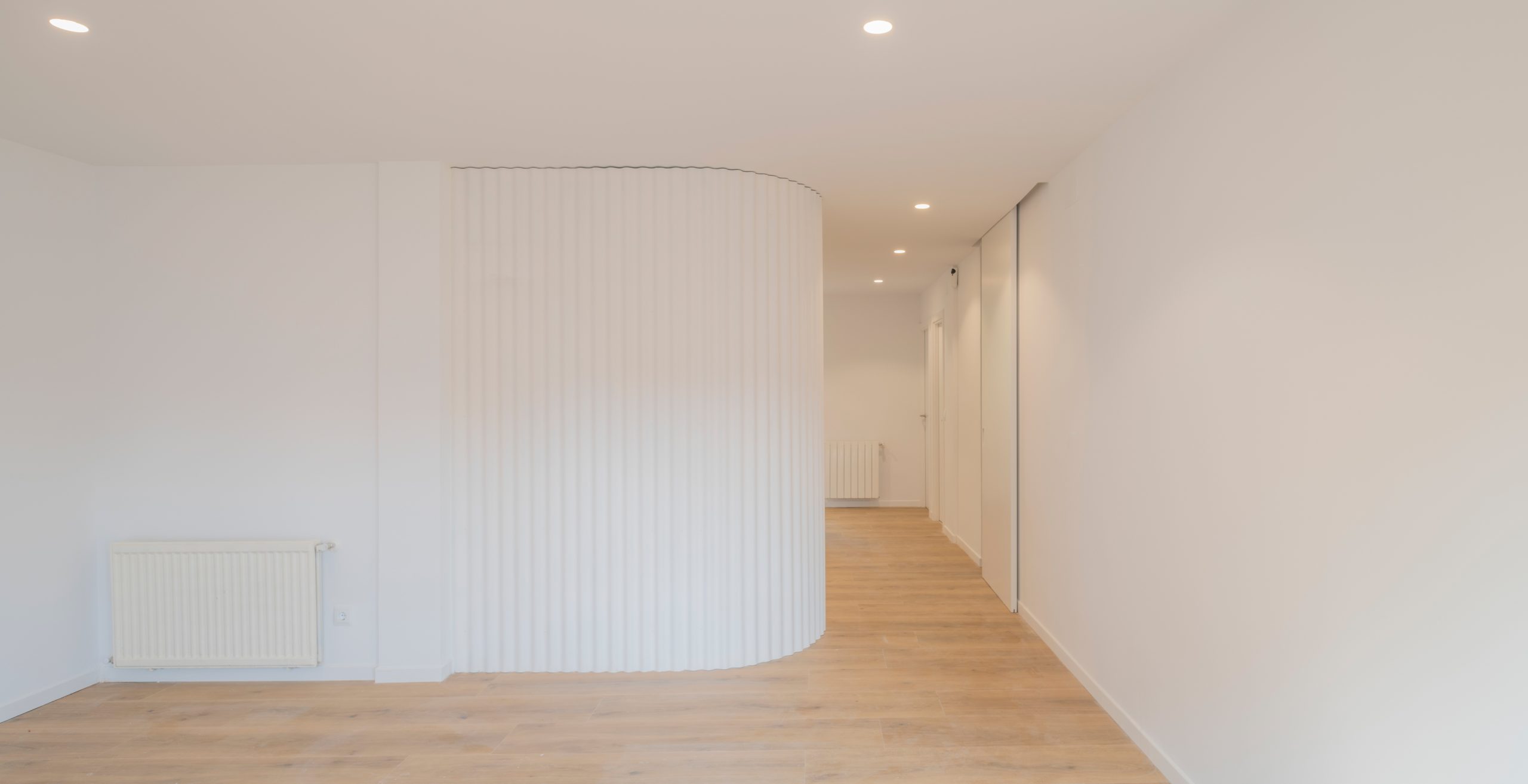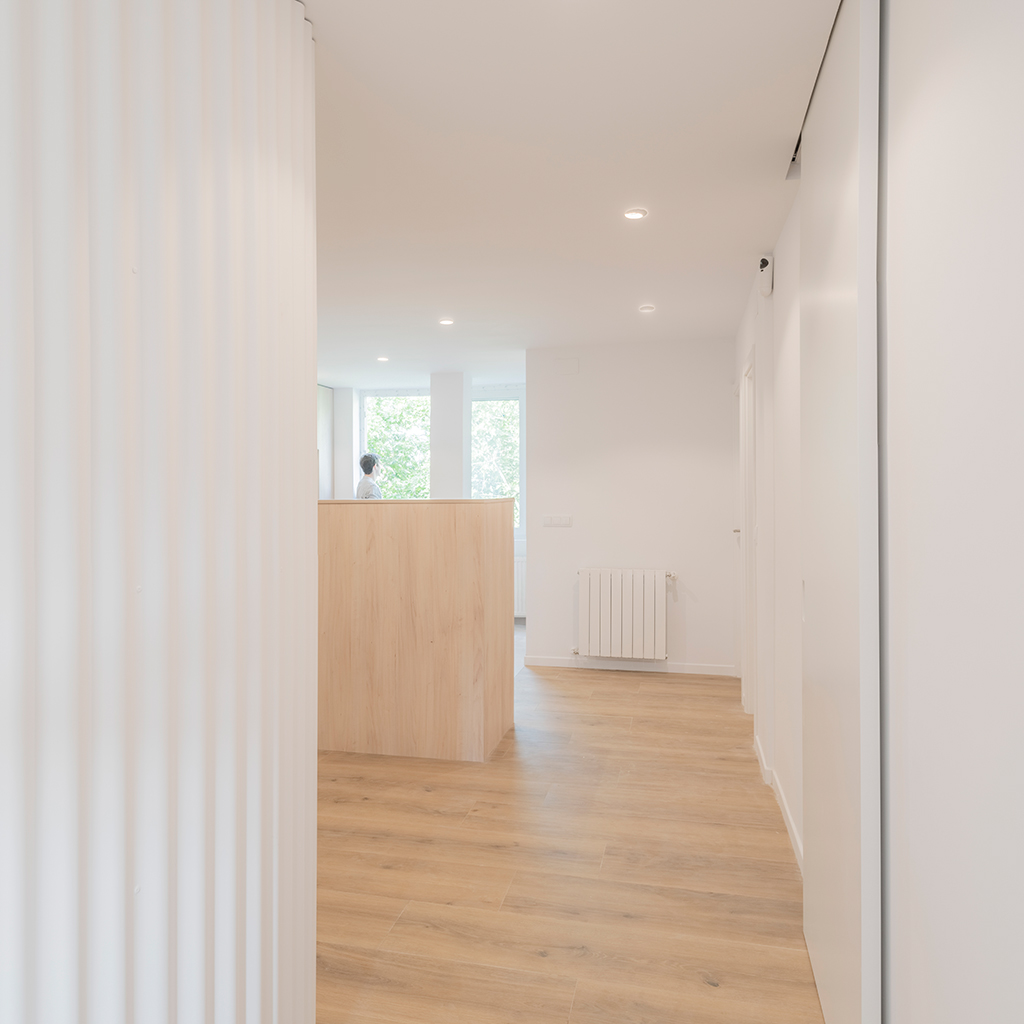 “Inv. Geométricas I” diseña una pieza programática vinculada al espacio de la entrada. Esta pieza curva funciona de eje entre la cocina y el salón-comedor, potenciando la fluidez espacial y dotando de privacidad al acceso. Existe una relación entre la entrada y la cocina a través de un elemento saliente de frente bajo para ampliar y conectar espacios.