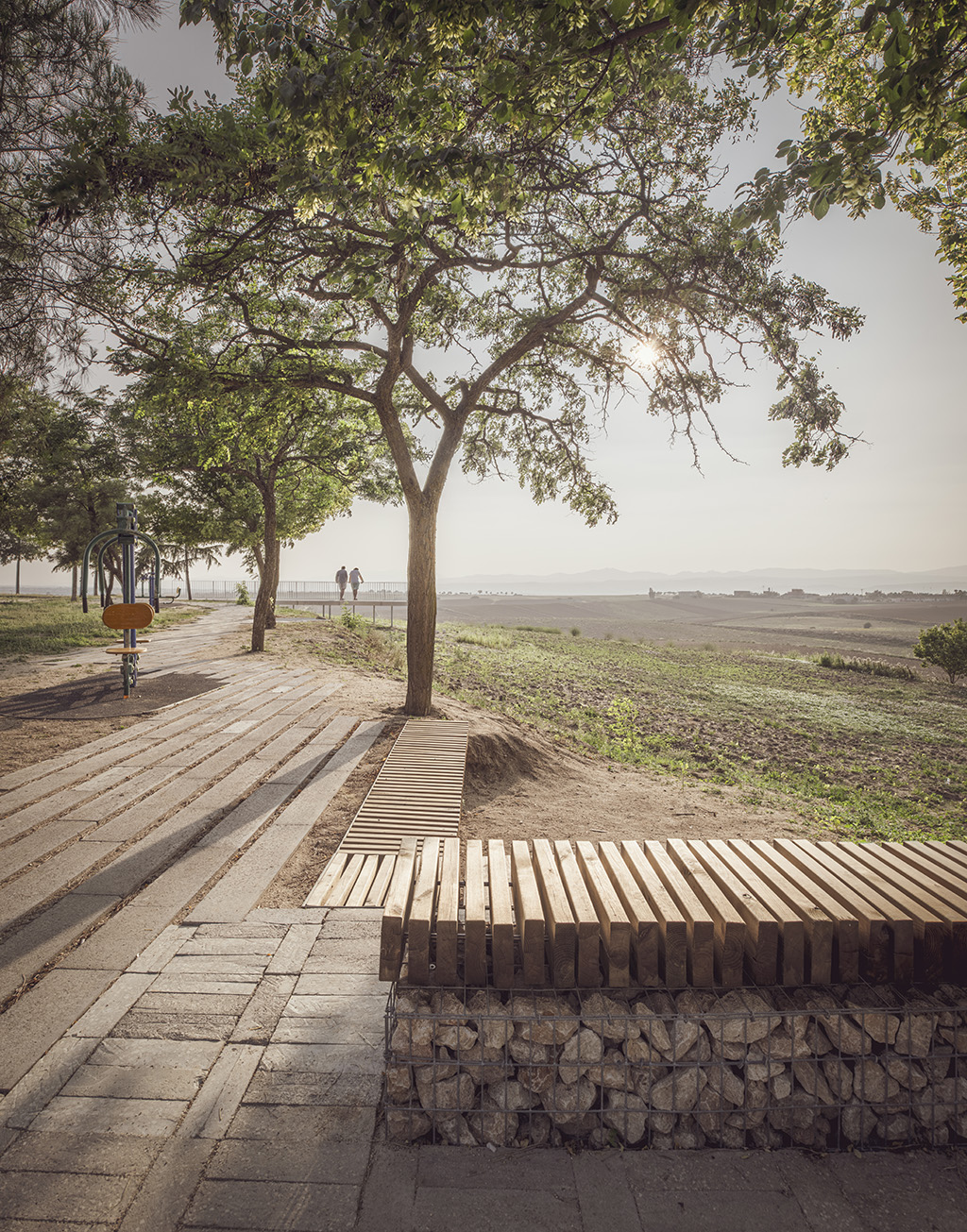 REUTILIZAR – Preexistencias: El proyecto plantea un nuevo trazado, reubicándolo al cobijo de los árboles existentes. Se construye reutilizando los bordillos de hormigón que anteriormente conformaban el borde de un camino rectilíneo y en desuso. Con este gesto, naturalizamos la zona del antiguo camino, economizamos la intervención, reducimos el impacto ecológico y revitalizamos el área de intervención.