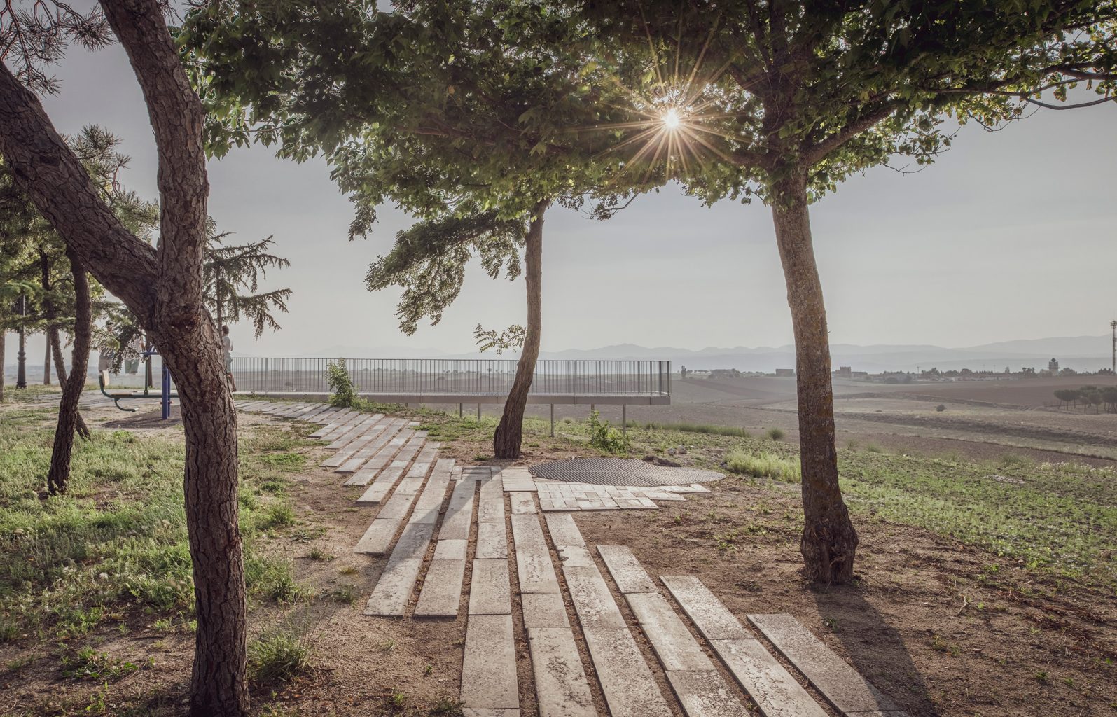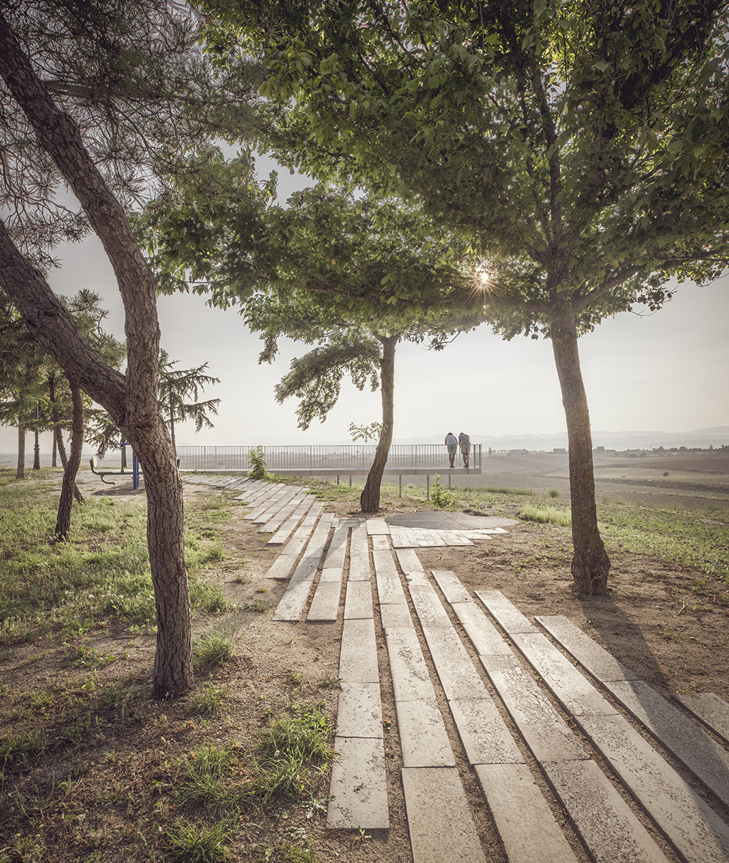 ROMPER – Pasarela. Una pasarela metálica rompe el límite topográfico, generando una nueva percepción espacial y metiendo al espectador directamente dentro de la escena, potenciándolo con un suelo permeable.
